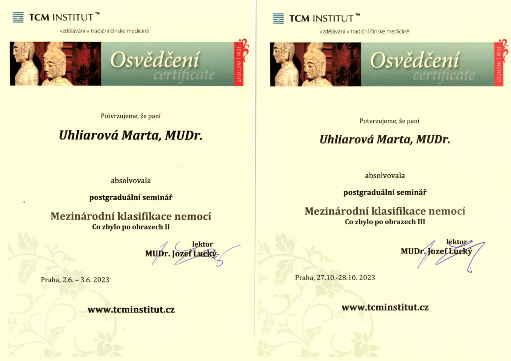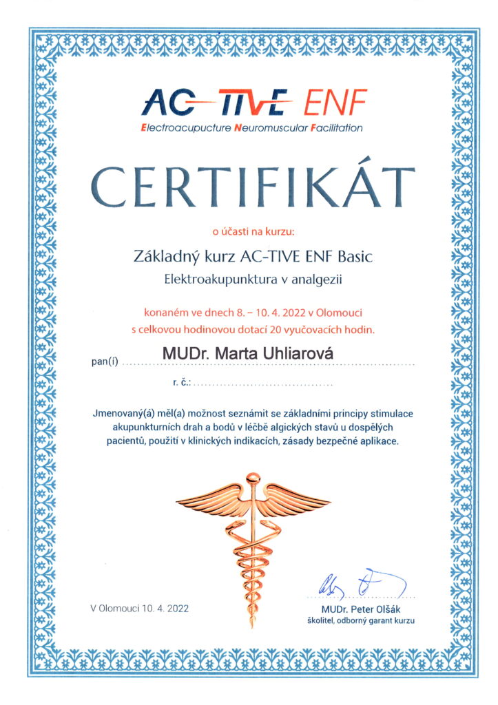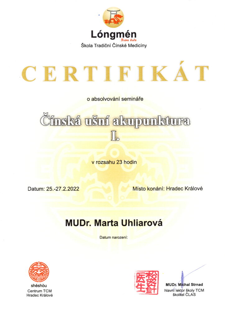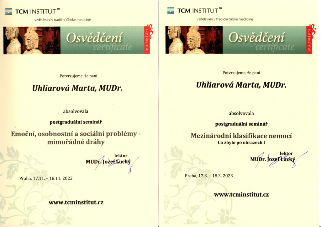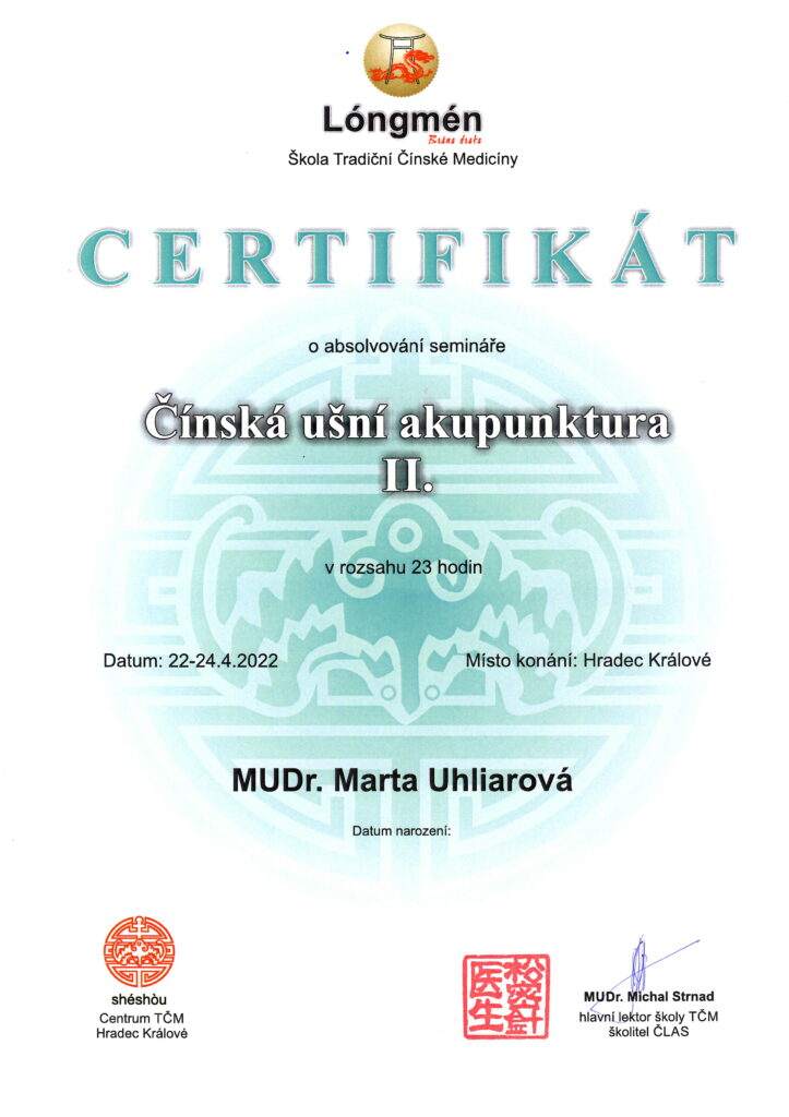 Absolvované vzdelanie Lekárska akupunktúra na Inštitúte postgraduálneho vzdelávania v Prahe aj na SZÚ v Bratislave