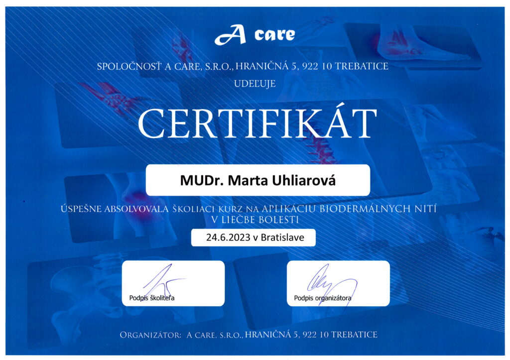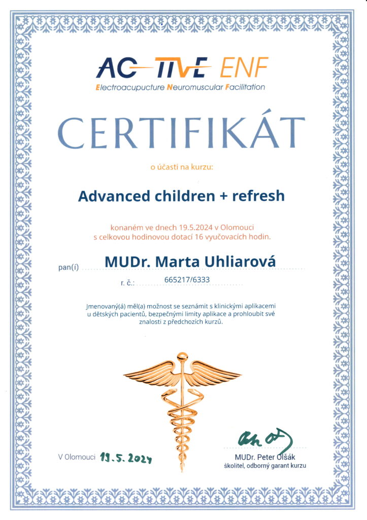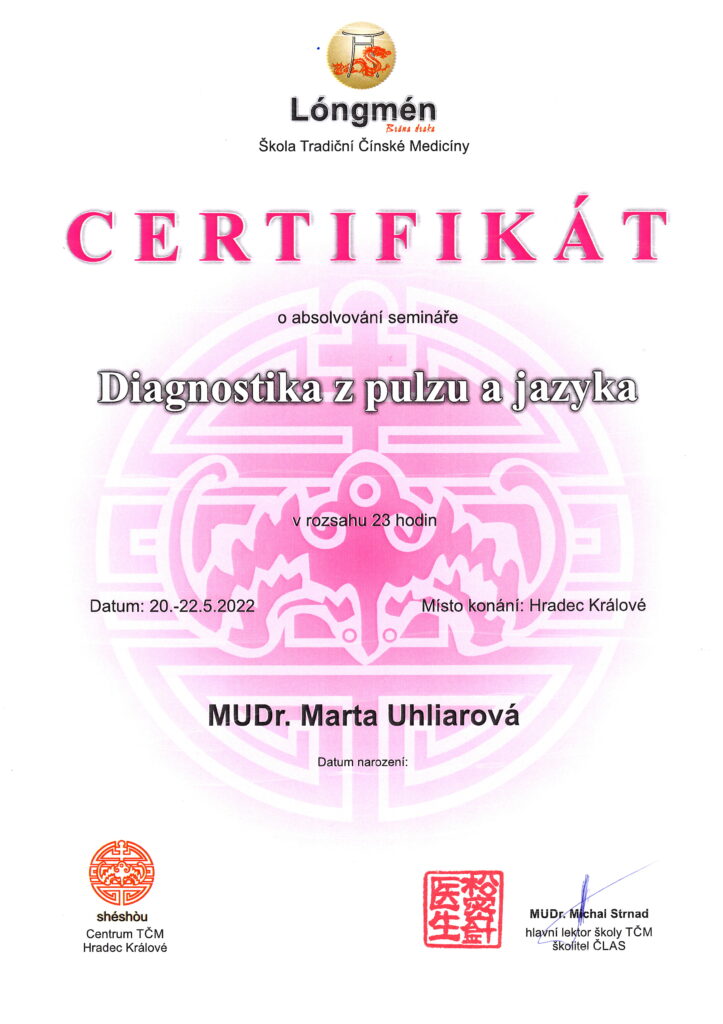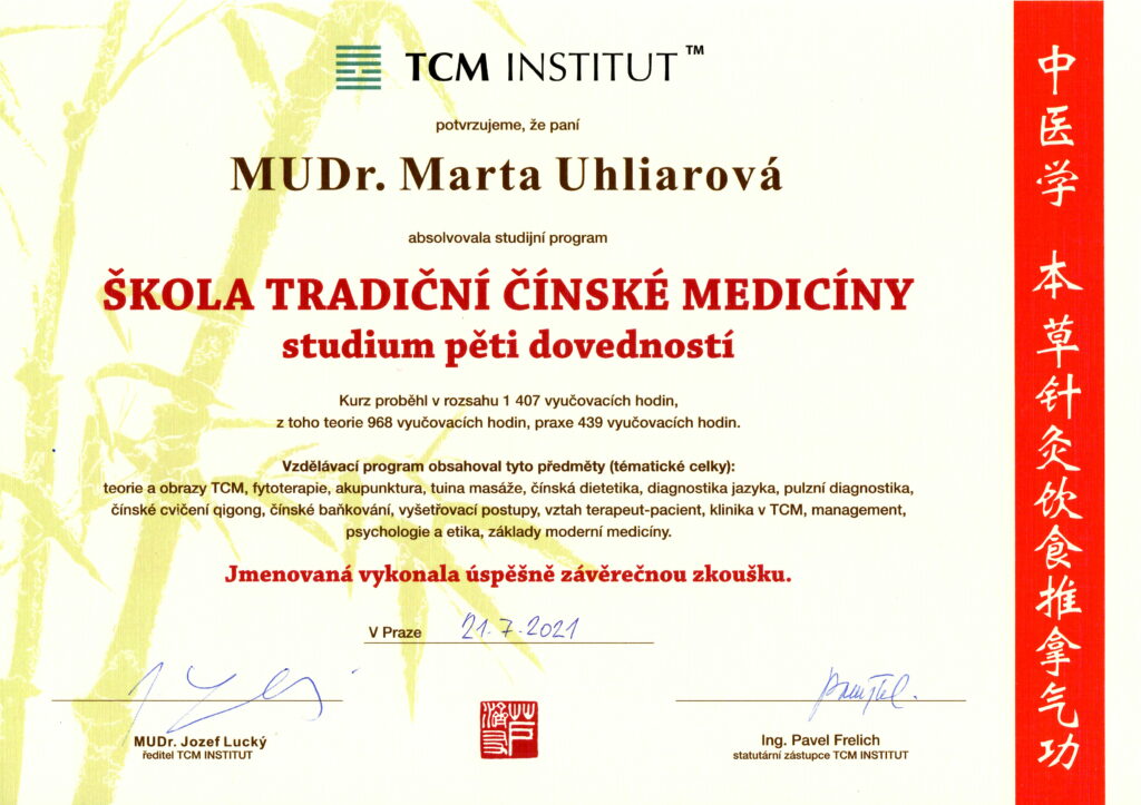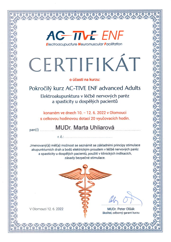 Absolvované vzdelanie Lekárska akupunktúra na Inštitúte postgraduálneho vzdelávania v Prahe aj na SZÚ v Bratislave